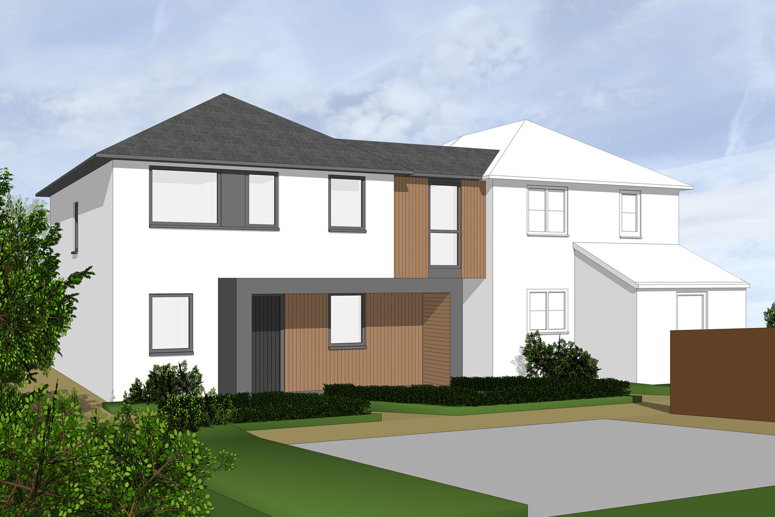 The proposed house is linked to the existing cottage and includes three double bedrooms, study and large open plan kitchen diner opening out to the garden at the rear. The form and materials closely resemble the existing cottage but the design is executed in a contemporary manner, consisting predominantly of natural slate and white render.